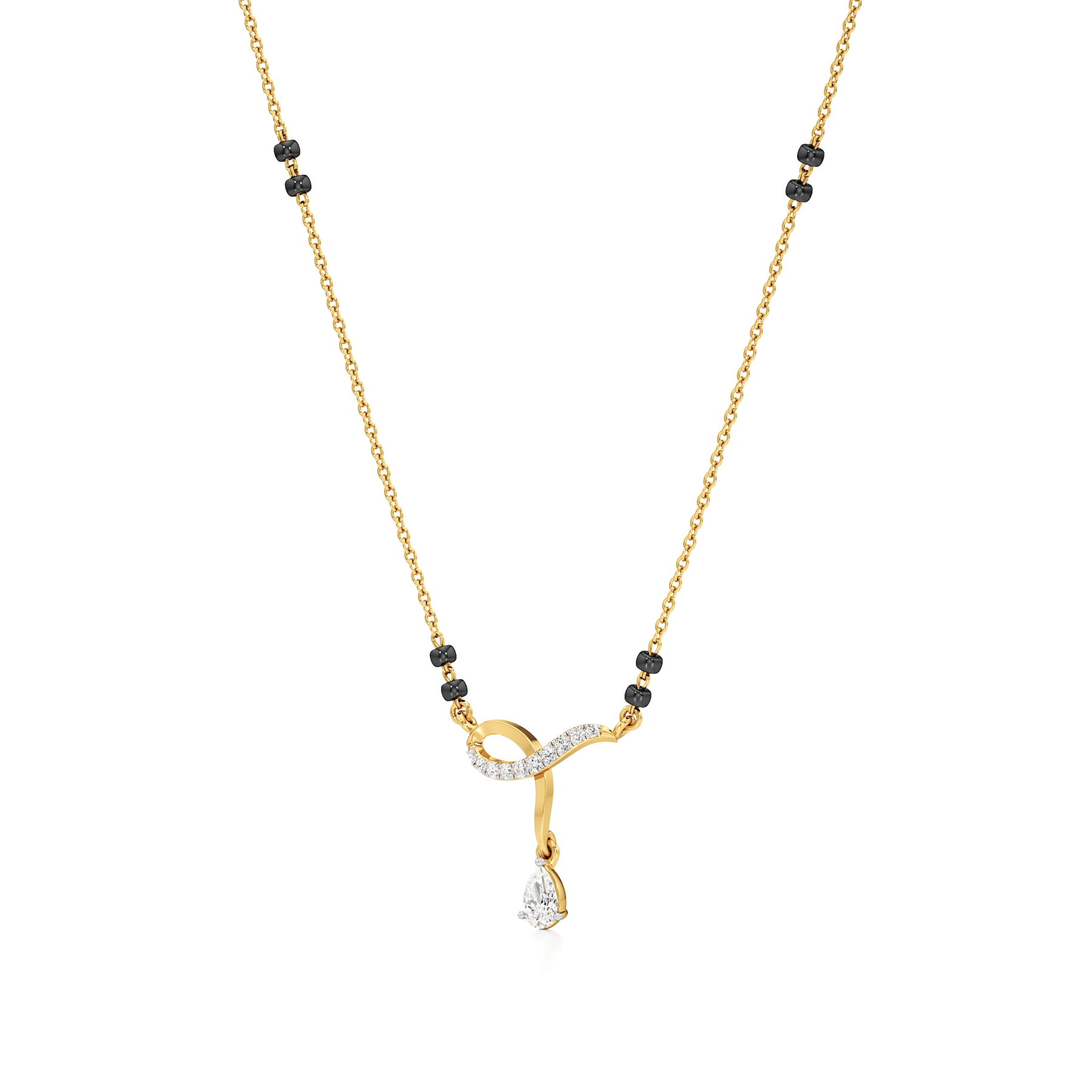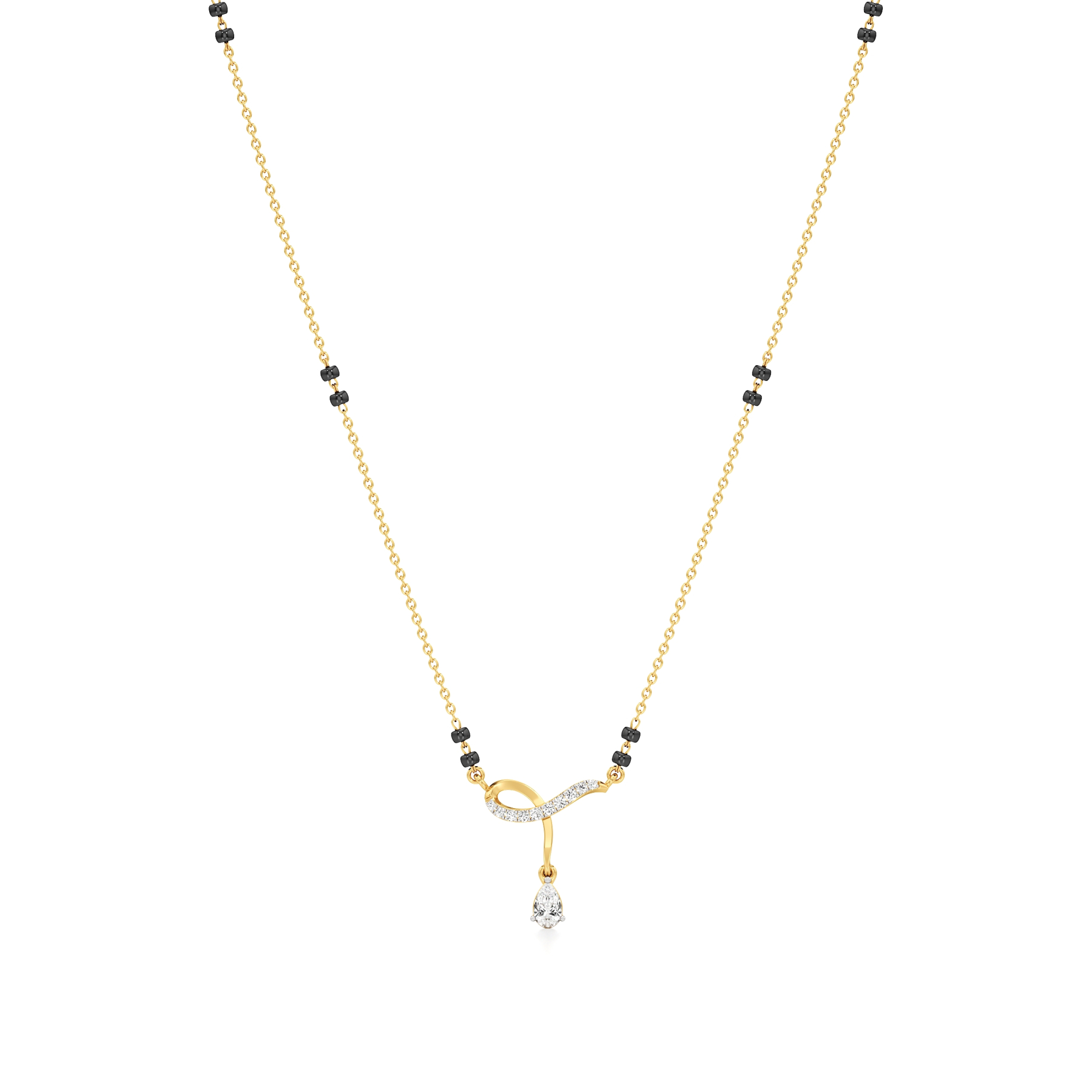 The Eternal Twist Diamond Mangalsutra from Aigiri features 0.35 carats of sparkling diamonds, highlighted by a graceful twisted gold design and a dangling pear-shaped diamond. Paired with traditional black beads, this piece beautifully blends elegance and cultural significance.