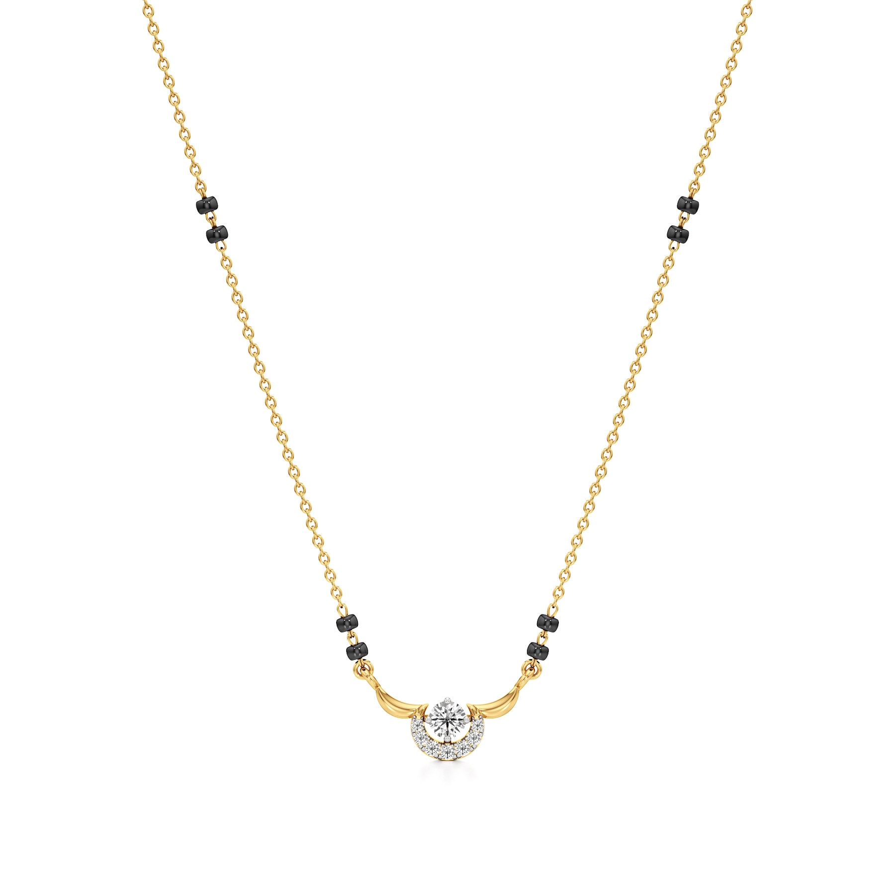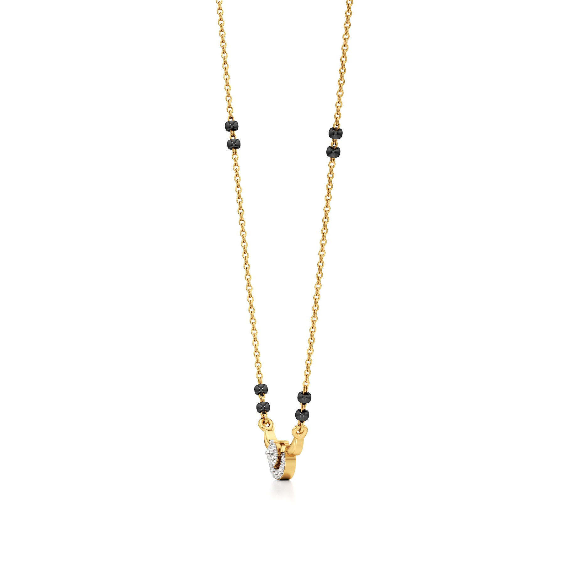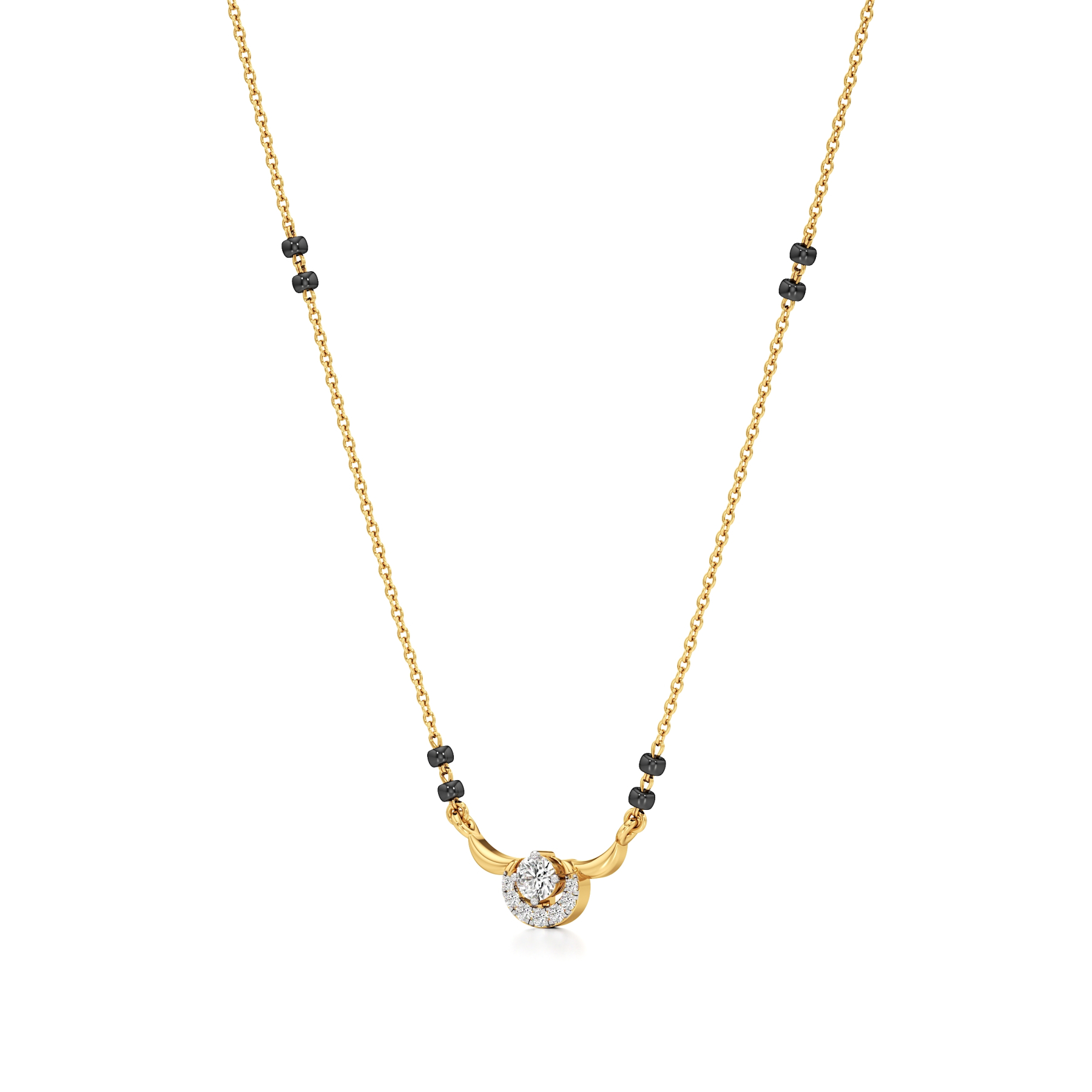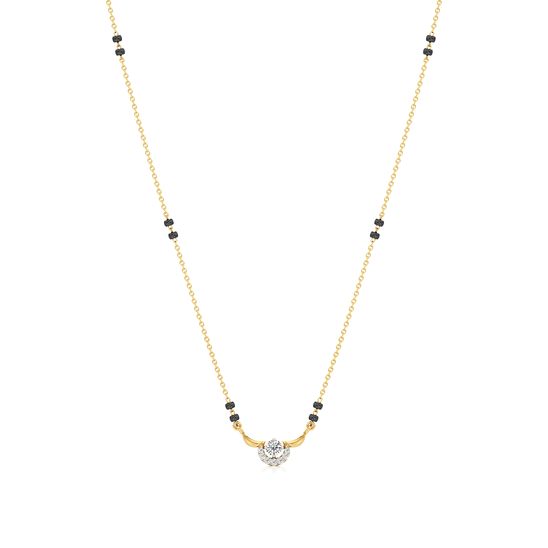 The Harmony Halo Diamond Mangalsutra from Aigiri features 0.25 carats of radiant diamonds set in a stunning circular halo design. Crafted in gold and adorned with traditional black beads, this elegant piece perfectly combines contemporary charm with timeless tradition.