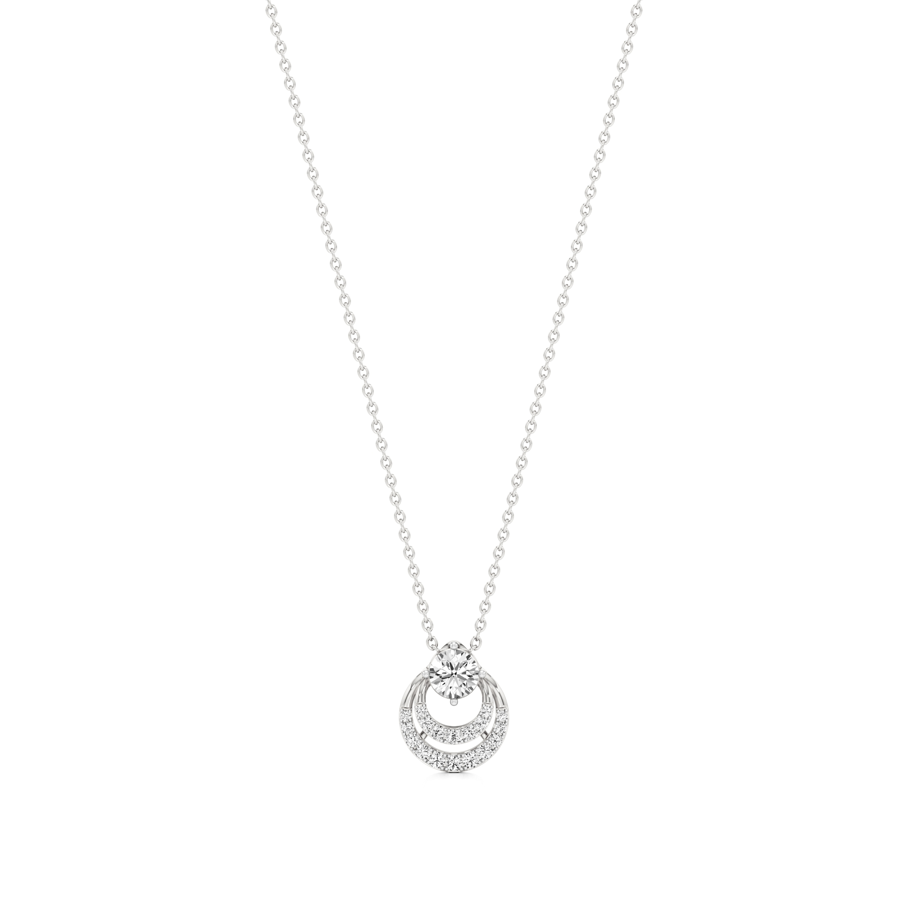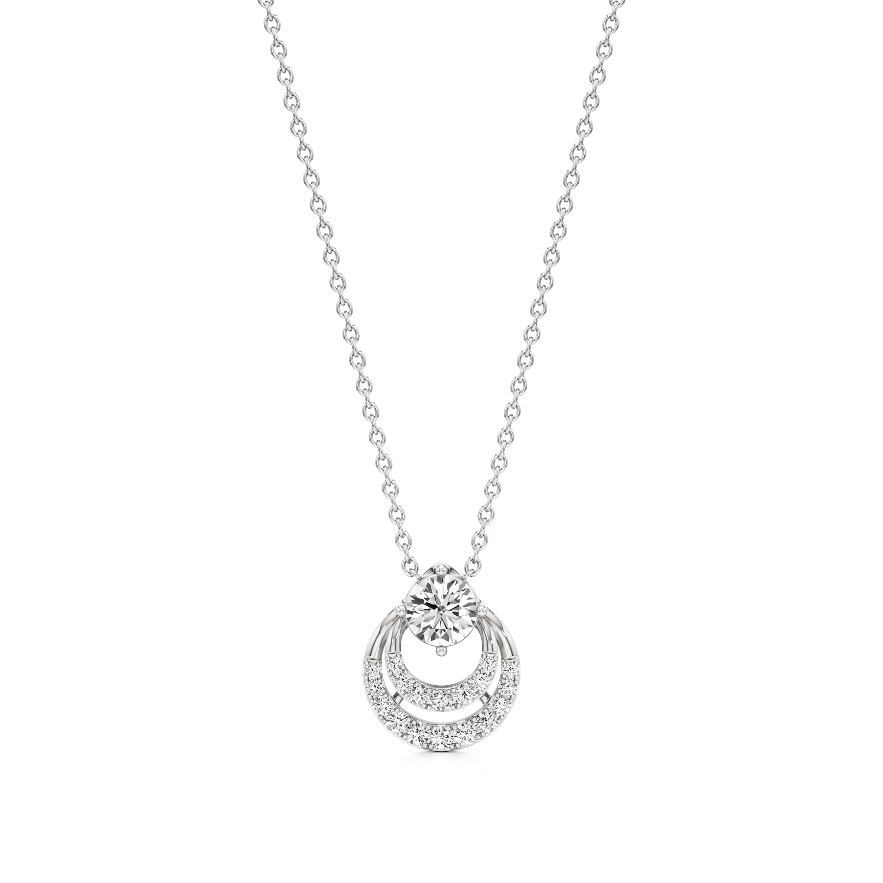 The Luna Glow Diamond Pendant features 0.60 carats of sparkling diamonds in a crescent-inspired design, centered with a radiant round diamond. This elegant pendant adds a touch of sophistication, making it perfect for weddings, festive occasions, or enhancing everyday style.