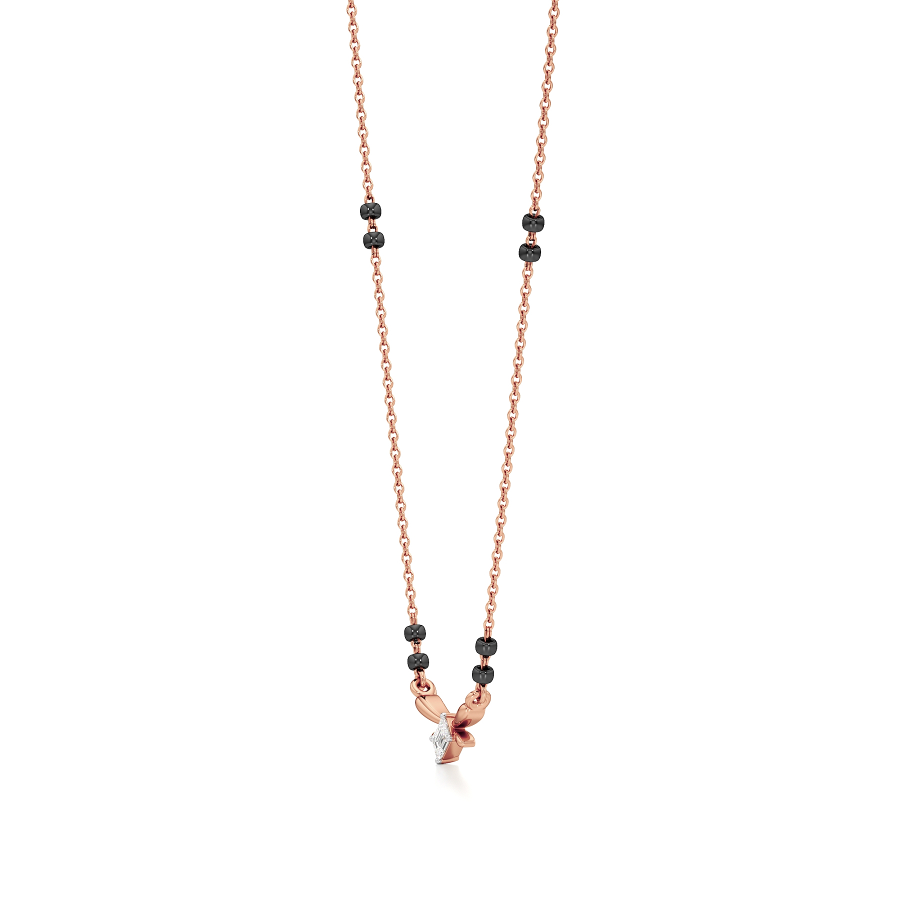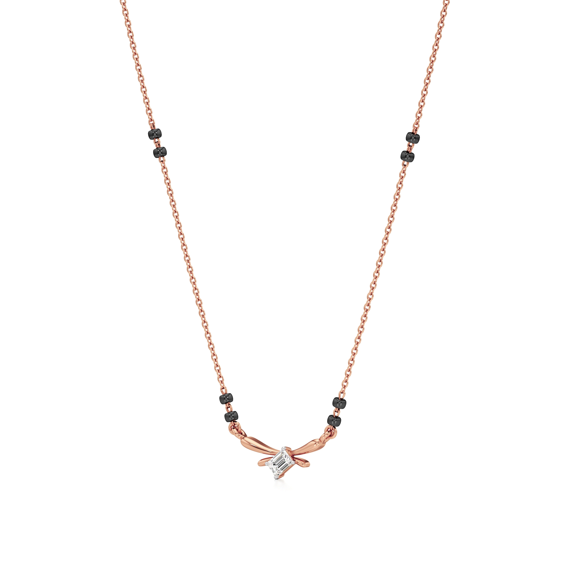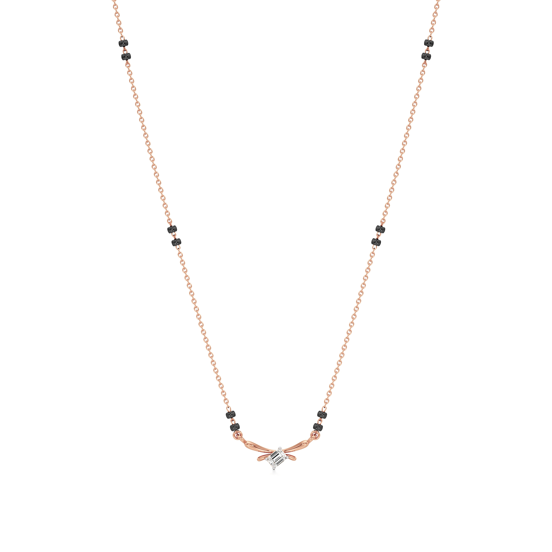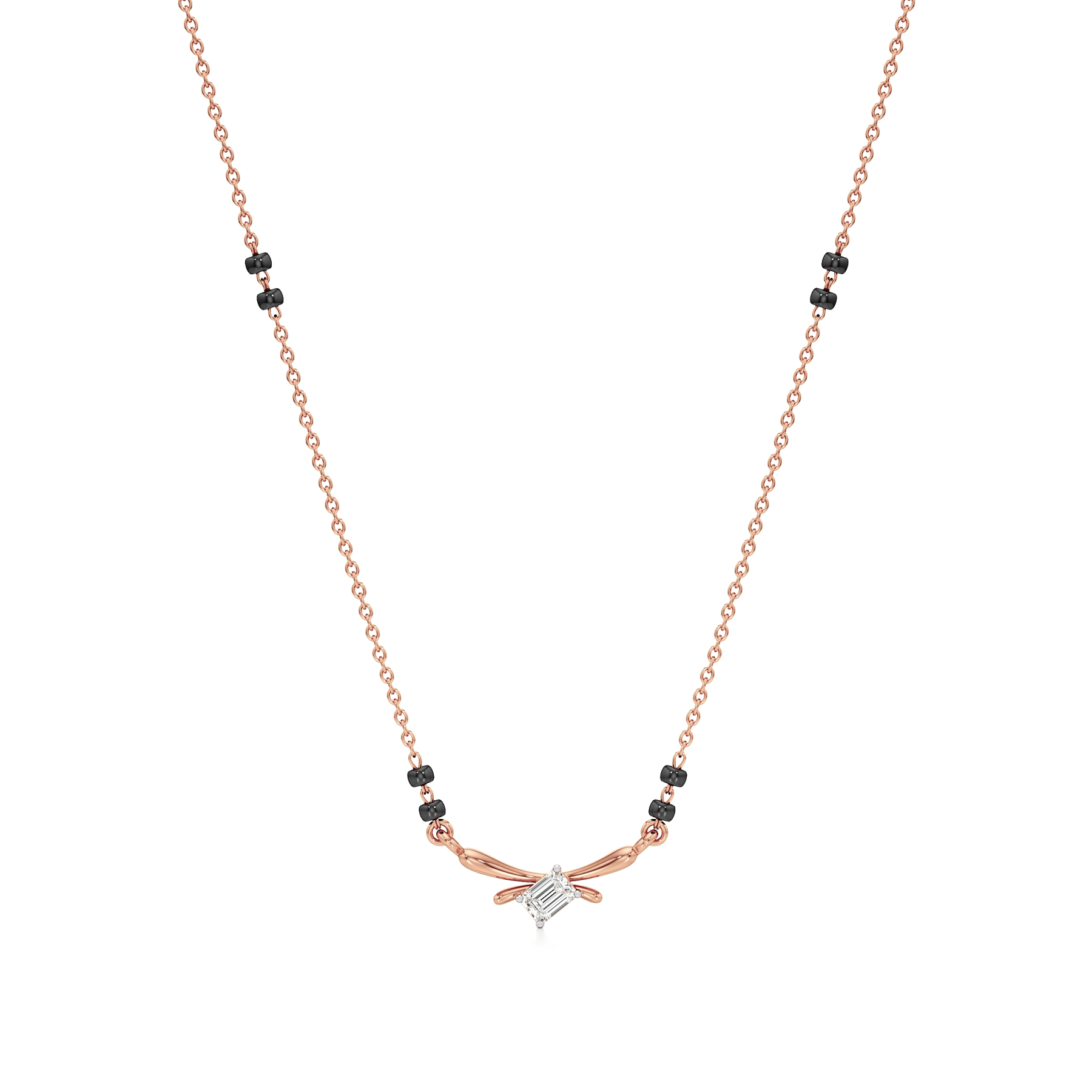 The Minimal Spark Diamond Mangalsutra from Aigiri features 0.20 carats of sparkling diamonds centered around an elegant baguette-cut diamond. Crafted in gold with sleek curves and traditional black beads, this mangalsutra is perfect for a refined and contemporary look.