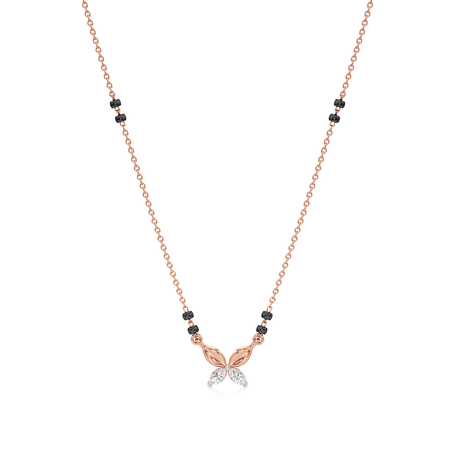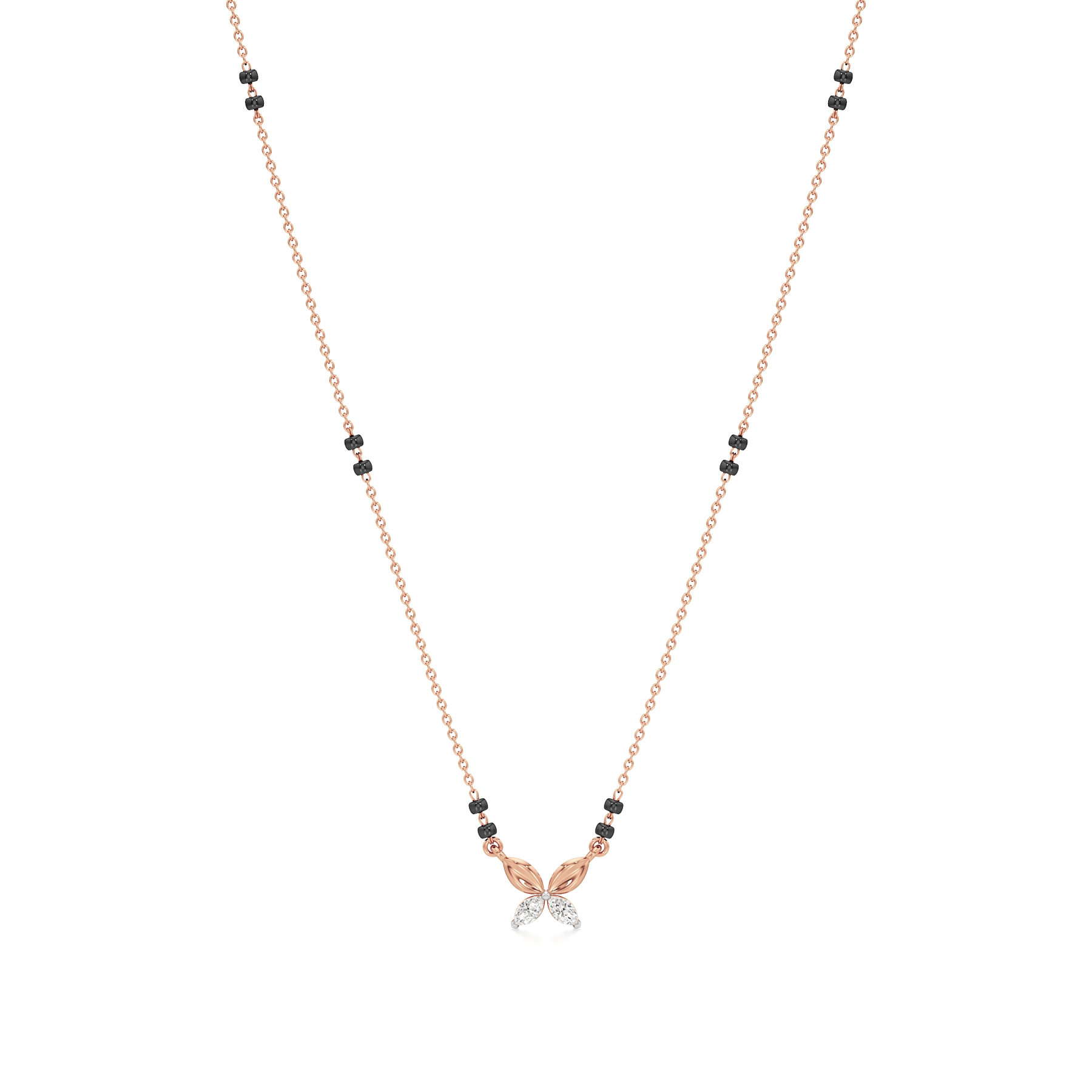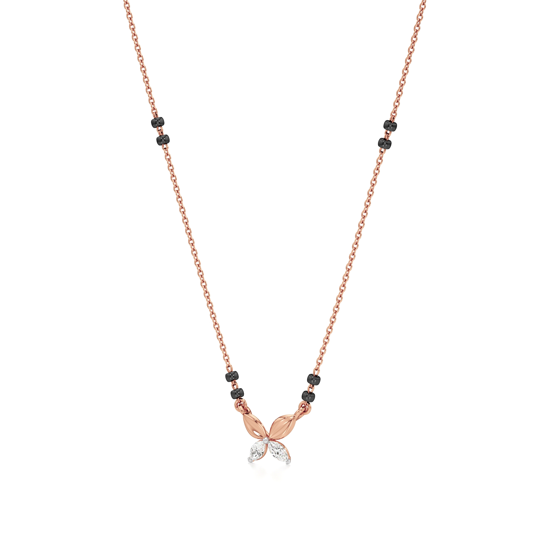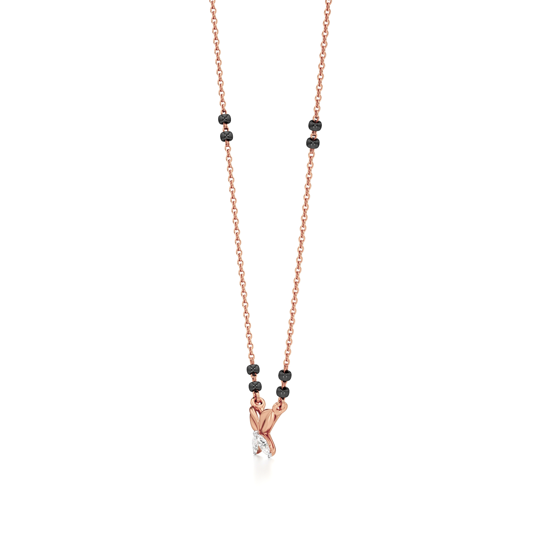 The Petite Elegance Diamond Mangalsutra from Aigiri features 0.20 carats of sparkling diamonds in a minimalistic design. Highlighted by delicate gold leaf motifs and a touch of tradition with black beads, this mangalsutra is perfect for modern, understated sophistication.