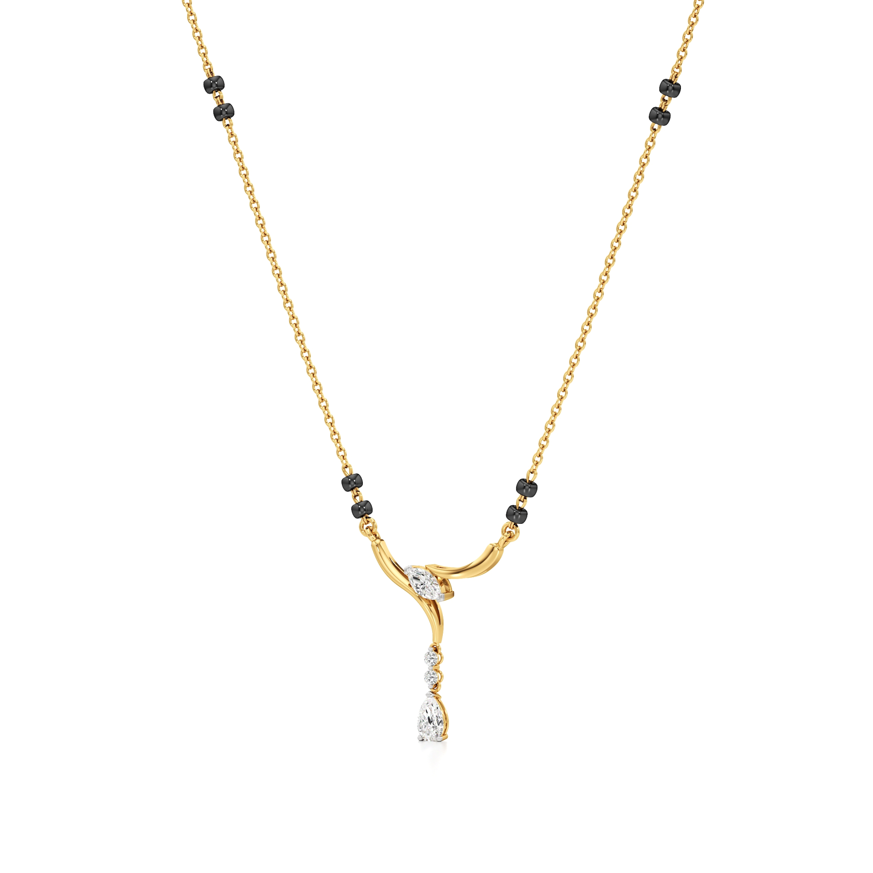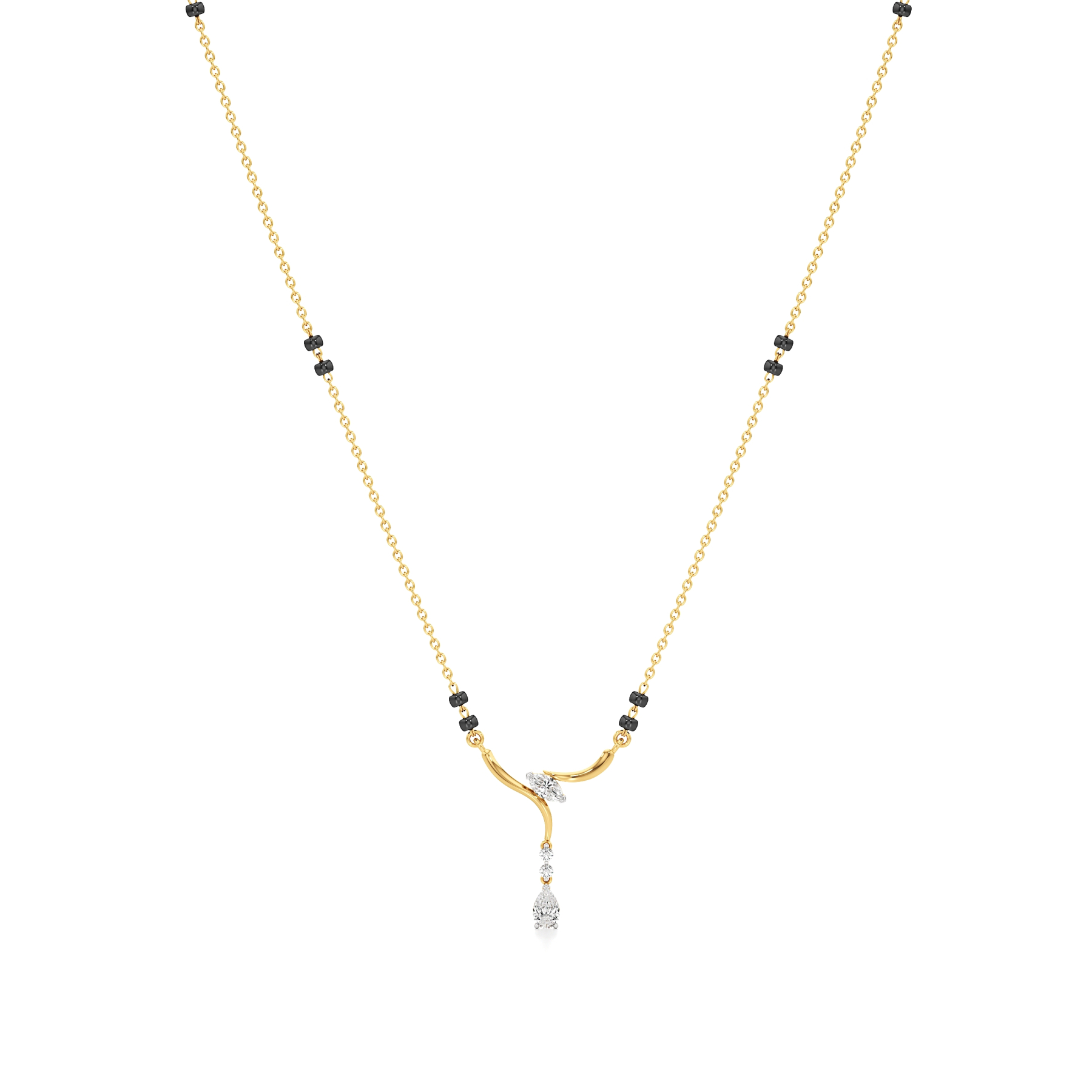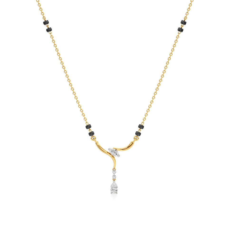 The Twilight Drop Diamond Mangalsutra from Aigiri showcases 0.25 carats of shimmering diamonds in an elegant flowing gold design. Highlighted by marquise and pear-shaped diamond accents with dangling details, complemented by traditional black beads, this piece is a perfect blend of modern style and timeless tradition.